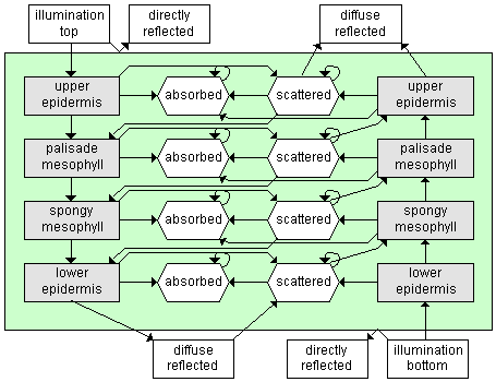 The SLOP (Stochastic model for Leaf Optical Properties) model (Maier et al., 1999; Maier, 2000) is an improved version of the stochastic model, which differs in that the leaf is partitioned into four different tissues.